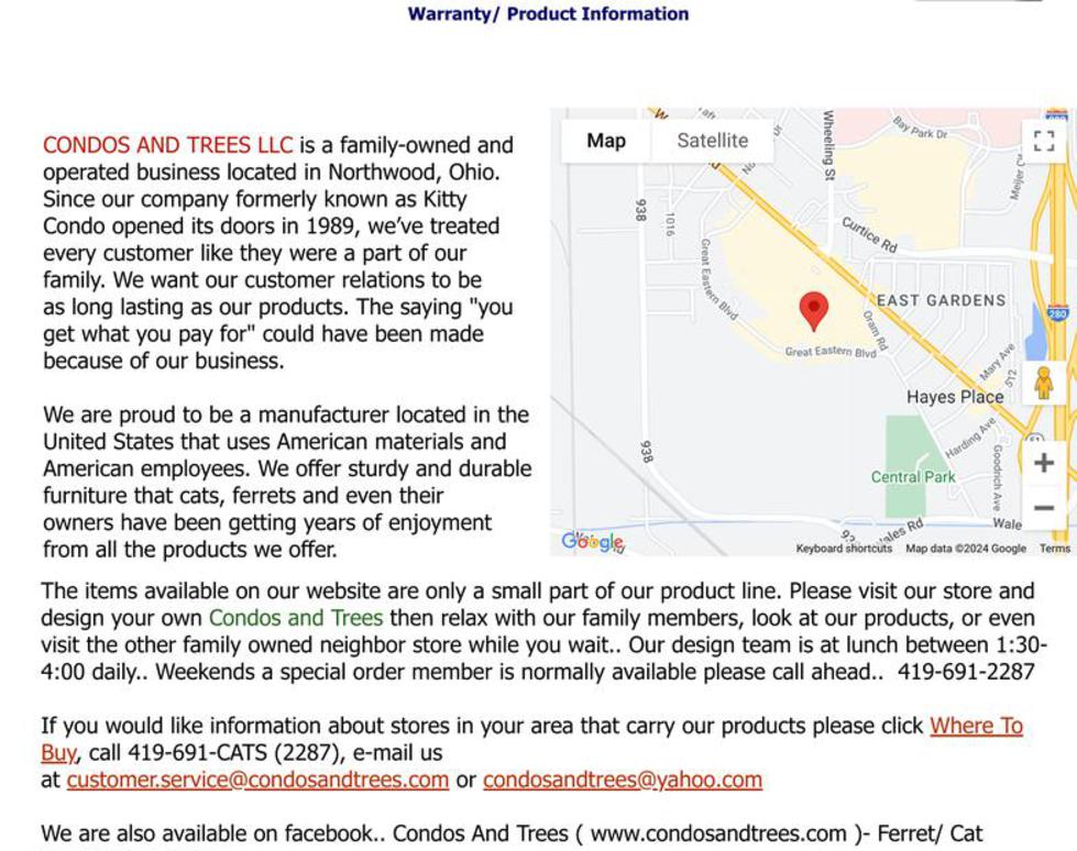CONDOS AND TREES LLC is a family-owned and operated business located in Northwood, Ohio. Since our company formerly known as Kitty Condo opened its doors in 1989, we’ve treated every customer like they were a part of our family. We want our customer relations to be as long lasting as our products. The saying "you get what you pay for" could have been made because of our business.